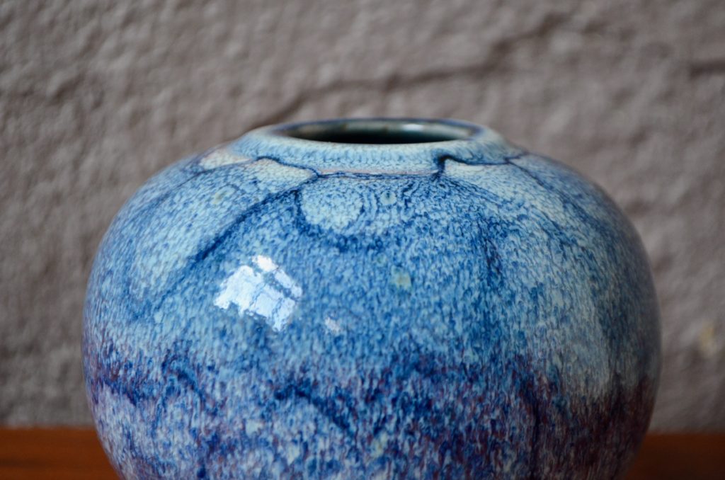 Ce joli vase boule est une véritable plongée dans l’eau d’une lagune du Pacifique. Les émaux cristallisés offre un bleu plein de nuances, variations et vaguelettes scintillantes. Le vase provient de la communauté de Taizé, de l’Atelier de Daniel de Montmollin.