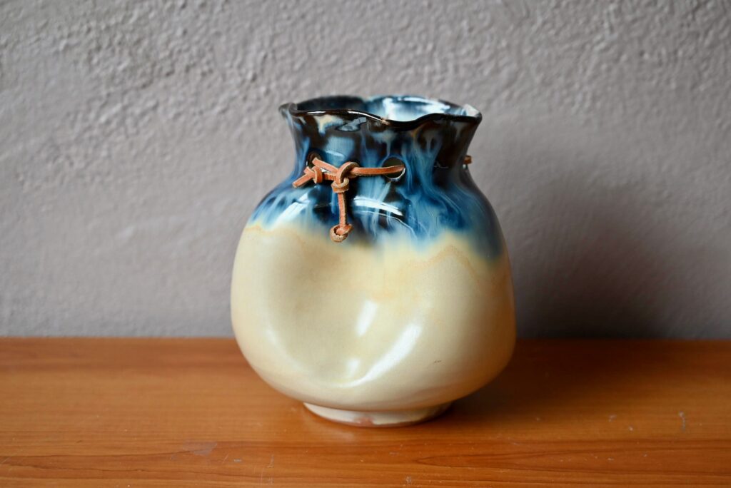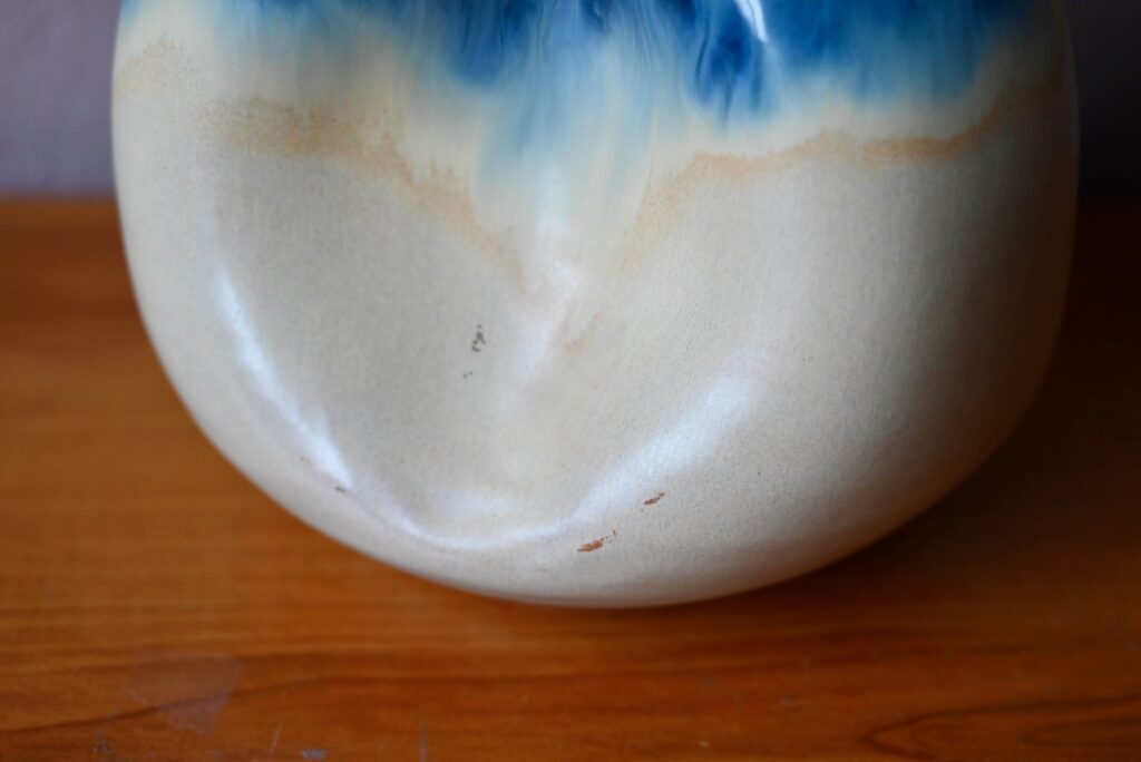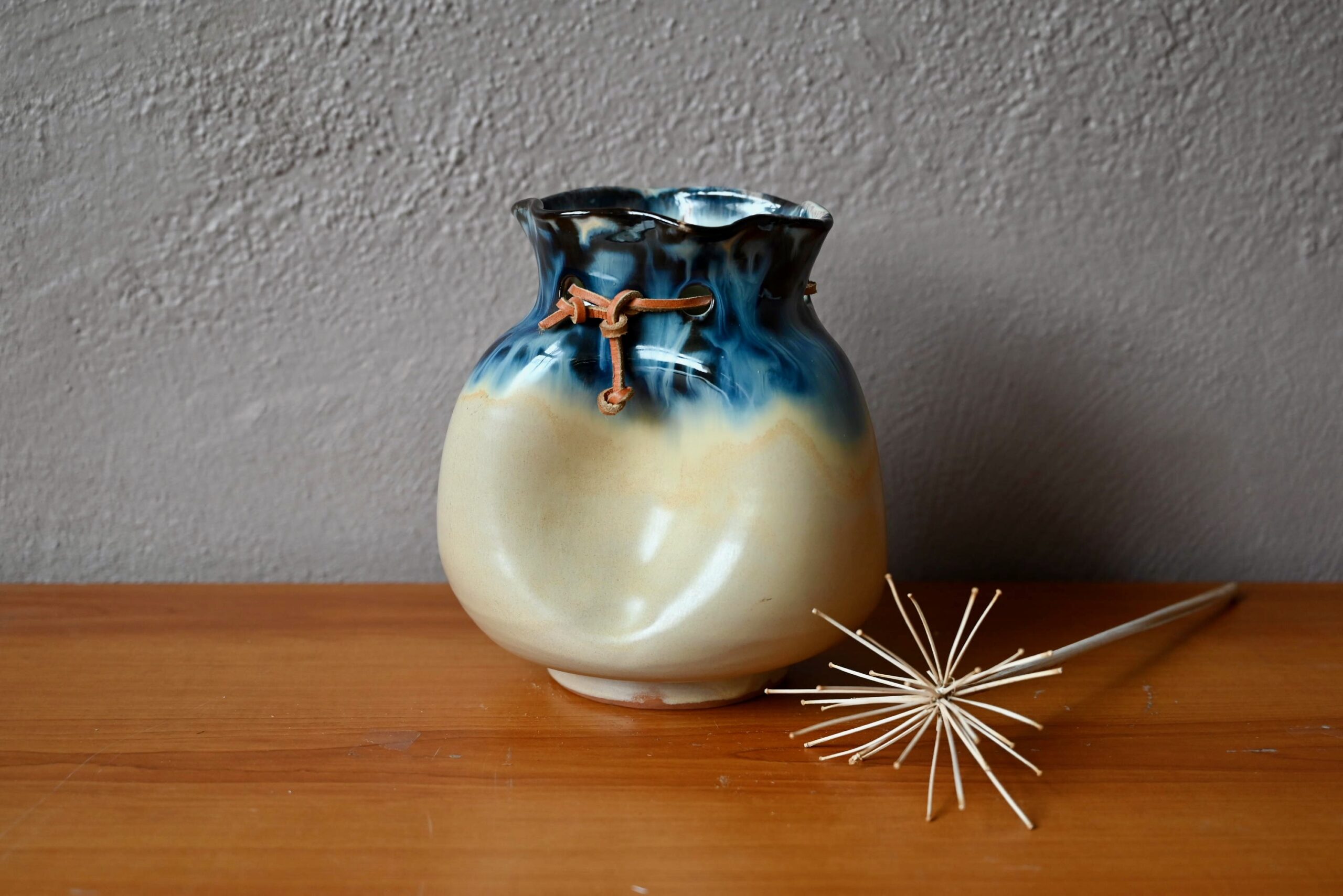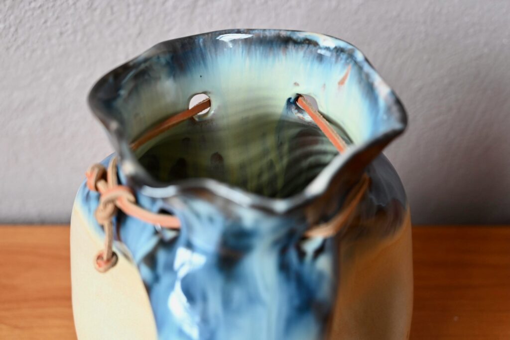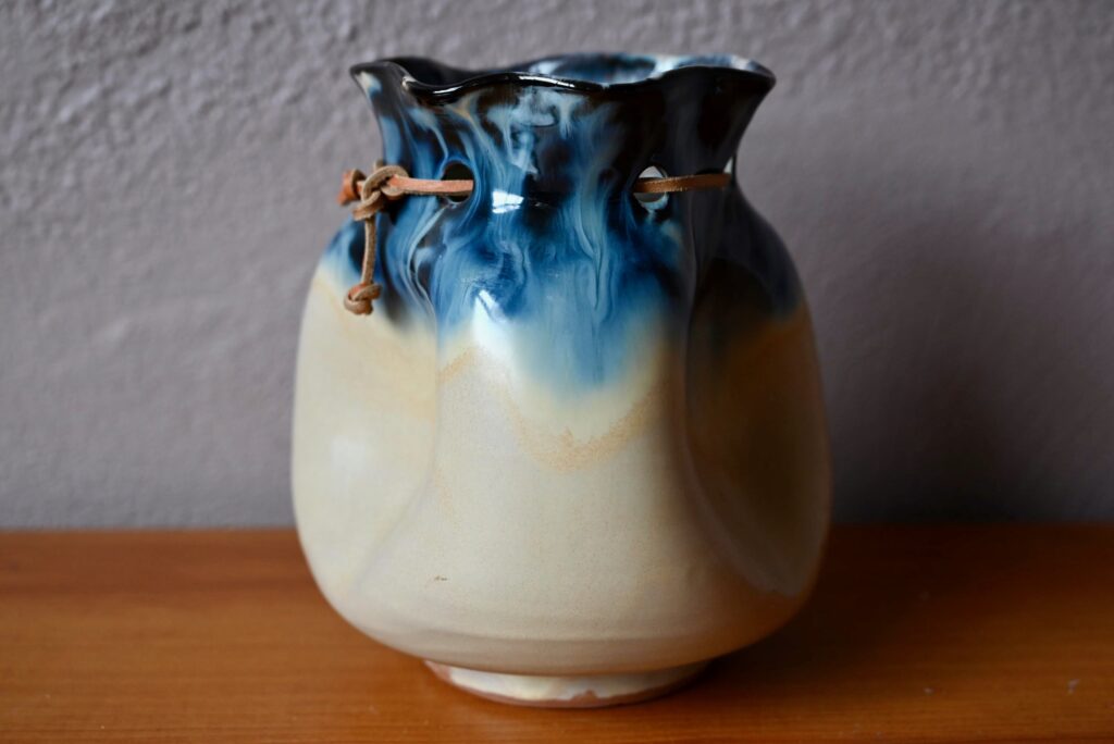 Le vase est en bel état, dans ds tons beige mat et émail bleu brillant. La céramique est une production du céramique espagnol Manuel Garcia Arroyo. Il comporte son cordon cuir d’origine, et une signature de l’artiste sur le dessous.