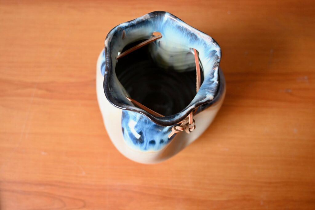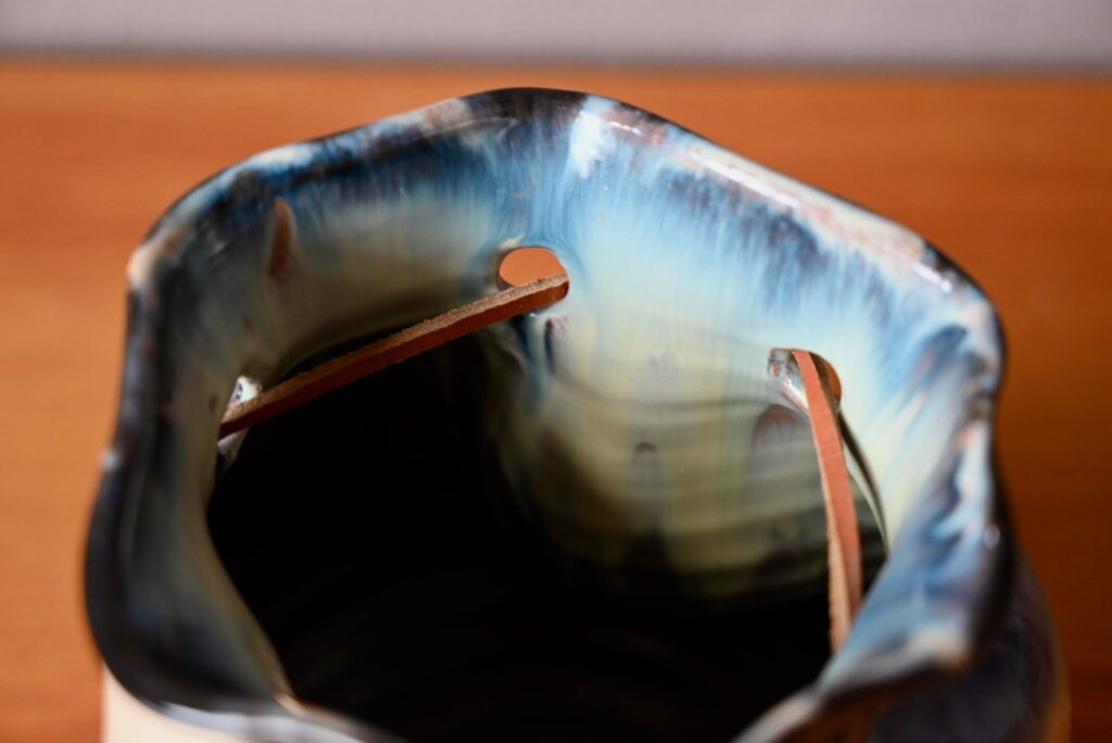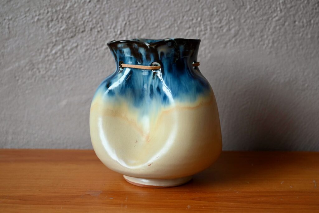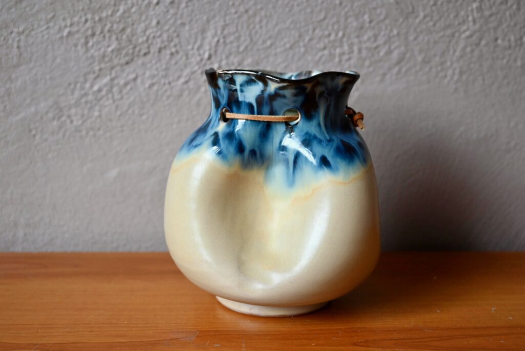 Ce vase bourse de Manuel Garcia Arroyo possède une forme unique et originale, il dégage une douce poésie. Doté d’un émail finement nuancé dans un registre de couleur bleu-noir et beige et d’un cordon cuir, il sera une jolie pièce déco posé sur un meuble ou utilisé en pot à crayons. Sa personnalité fera mouche dans une déco éclectique et soignée.