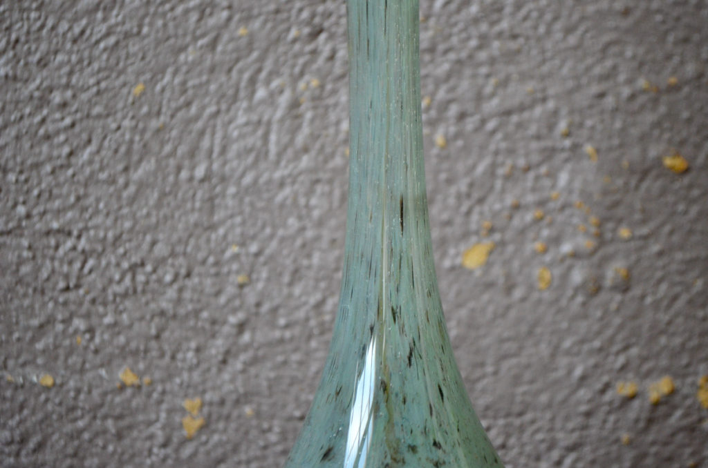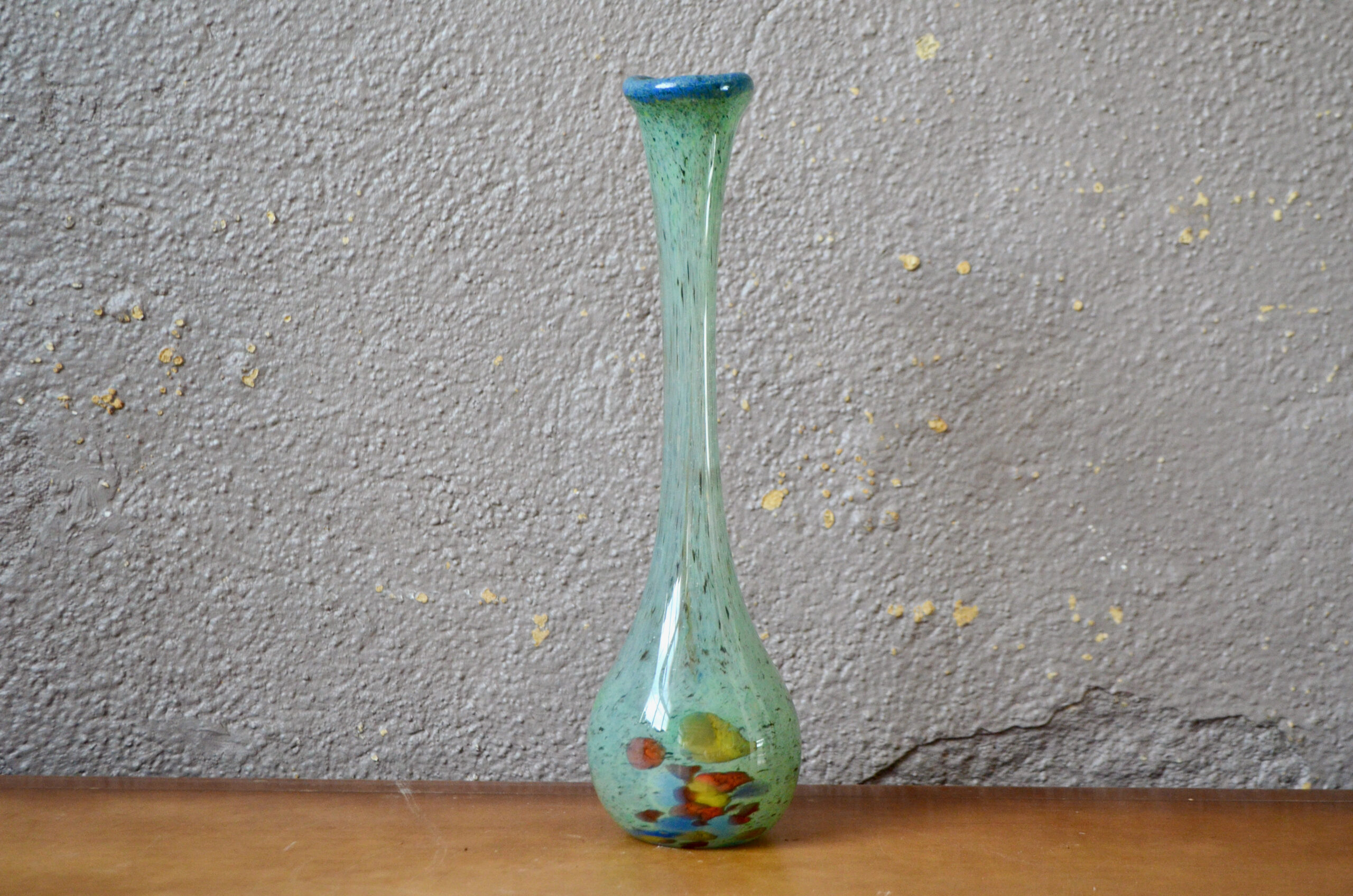 Ce joli vase en pâte de verre multicolore est une production artisanale pleine d’un charme bohème et chic. Avec sa base en forme de bulbe, son long col étiré et évasé sur le dessus, il possède une forme intéressante et décorative.