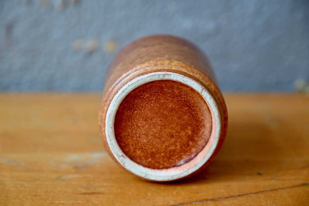 En forme de cylindre tronqué, ce petit vase est une production de l’artiste haut en couleurs, Roberto Rigon. Cette céramique s’intègre parfaitement dans l’esprit du design italien des années 70. La couvert beige est souligné d’un brun moucheté terre de Sienne, disposé en dégradé et caractéristique du travail du céramiste italien. Le vase est de petites dimensions. Il sera parfait en déco, ou utilisé en porte-crayons sur un bureau.