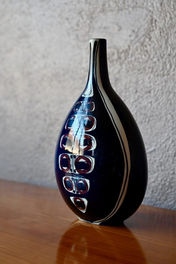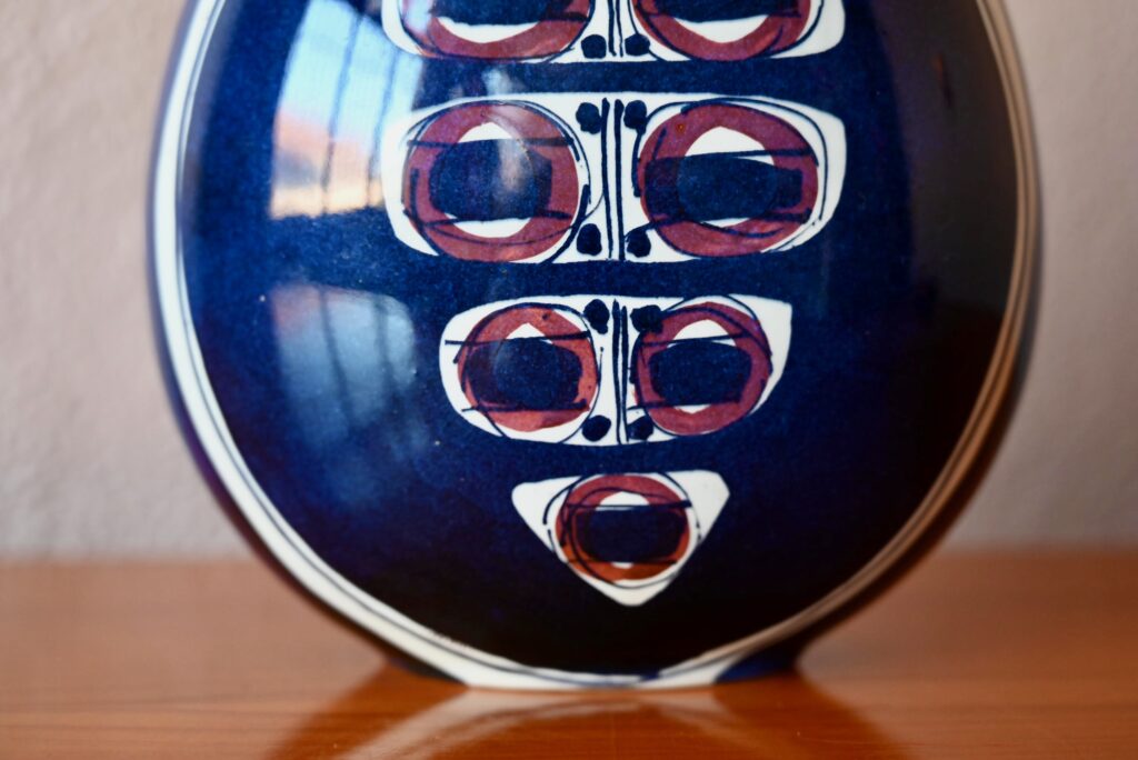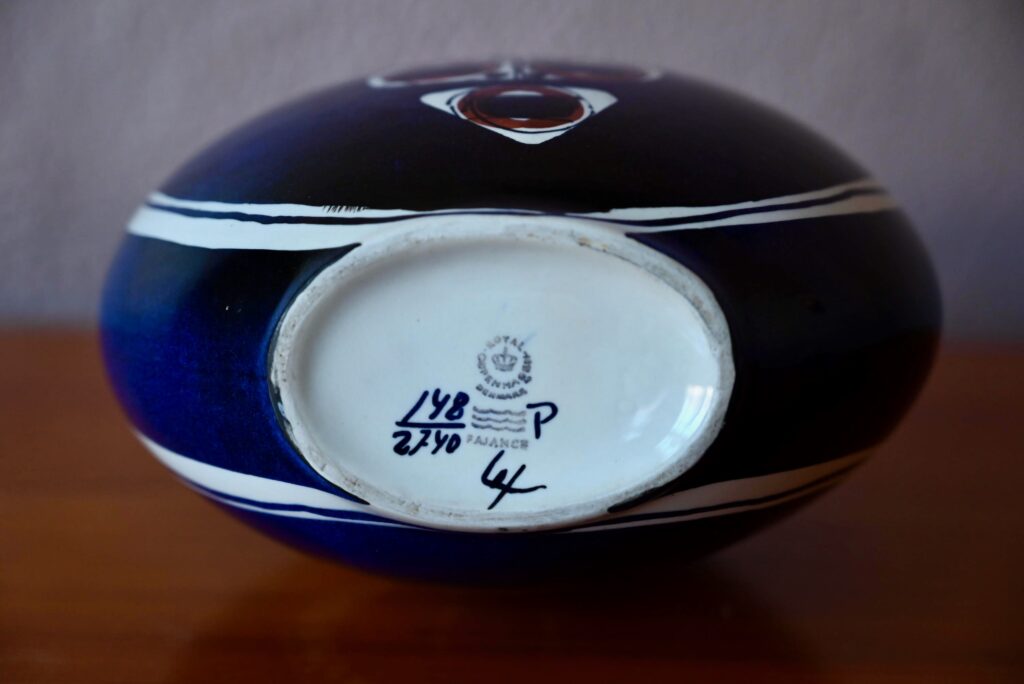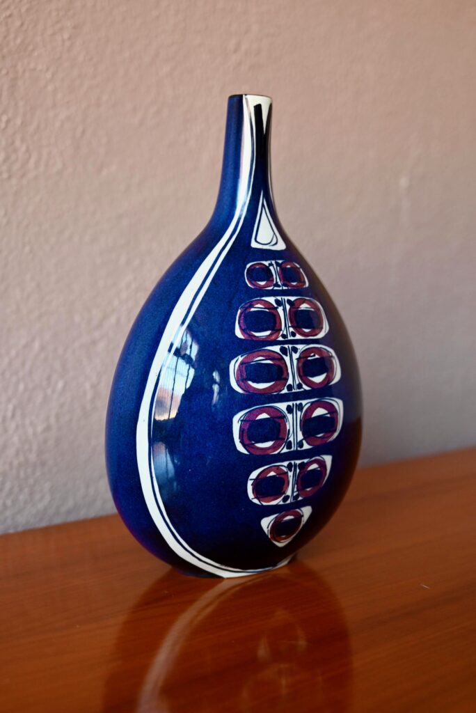 Le vase est en porcelaine danoise et date des années 60. Il est en très bel état. Les décors sont très fins dans les tons bleu profond, blanc et aubergine. Le vase est signé sur l’envers.