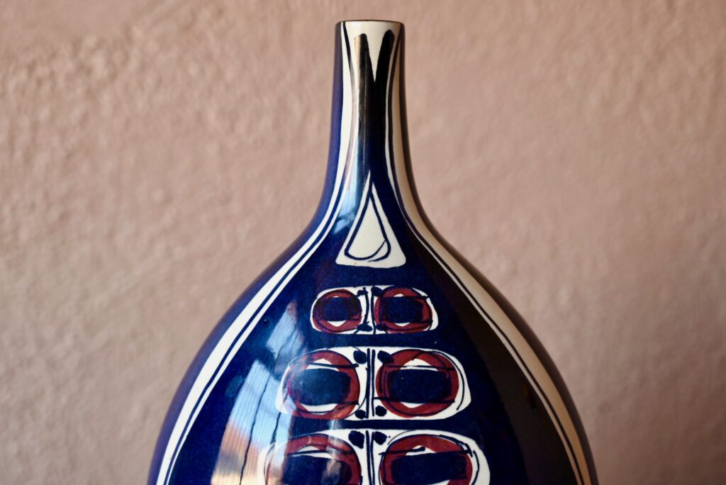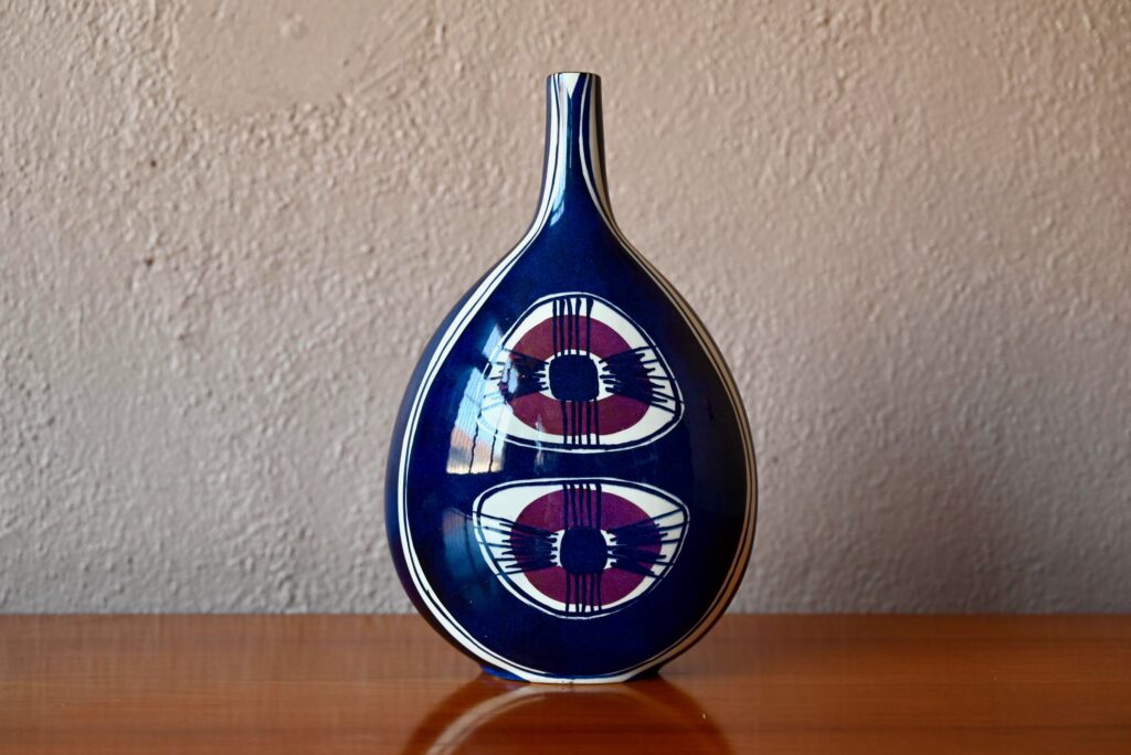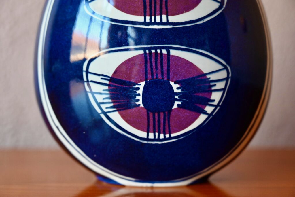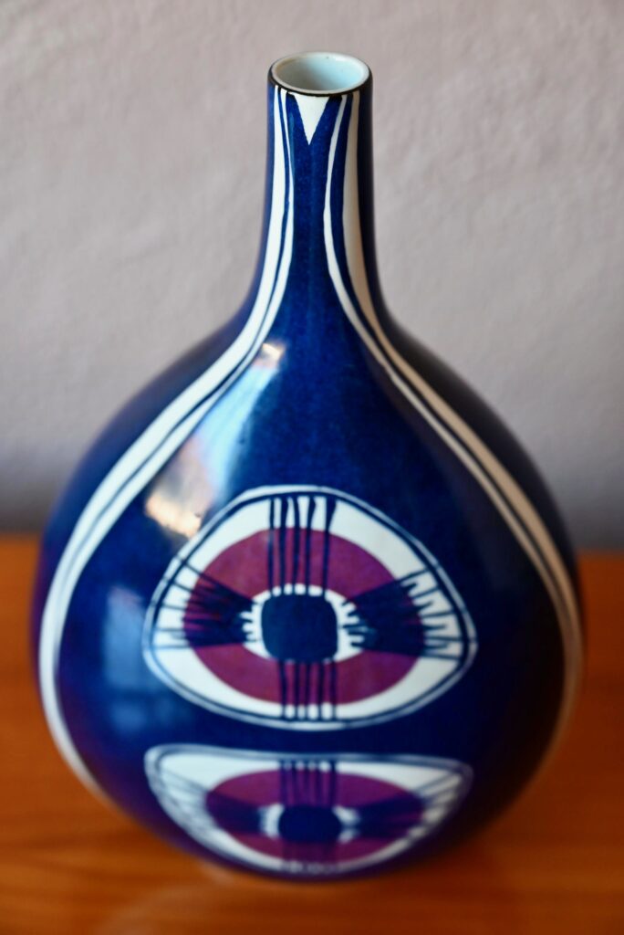 Chiné lors de vacances danoises, la finesse de ce vase nous a séduits… Imaginé par Inge-Lise Koefoed dans les années 60, ce vase affiche des lignes fluides et élégantes. Les motifs très stylisés et colorés apportent un contraste surprenant et moderne. Dans un bleu si particulier et caractéristique de la manufacture danoise, des “yeux” peints à la main ornent la céramique, formant un dessin différent de part et d’autre de ce vase bouteille.