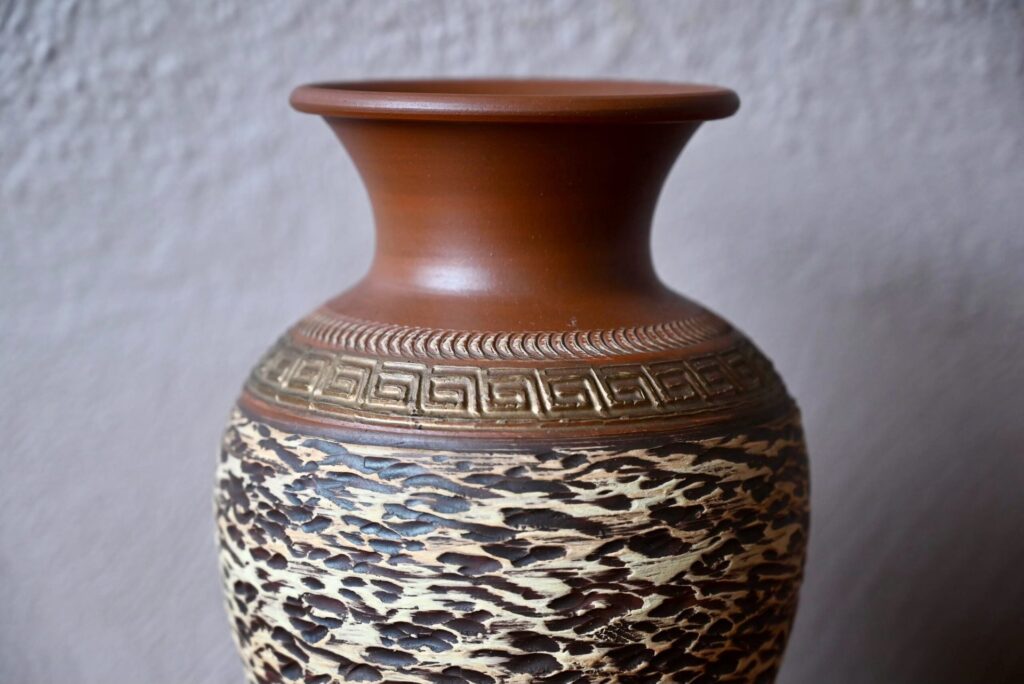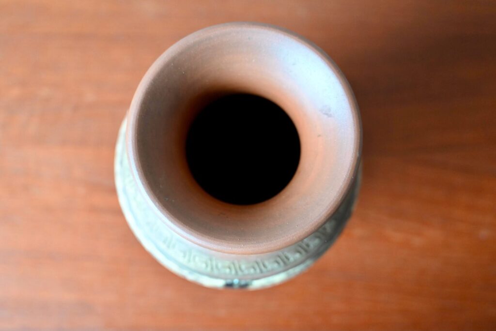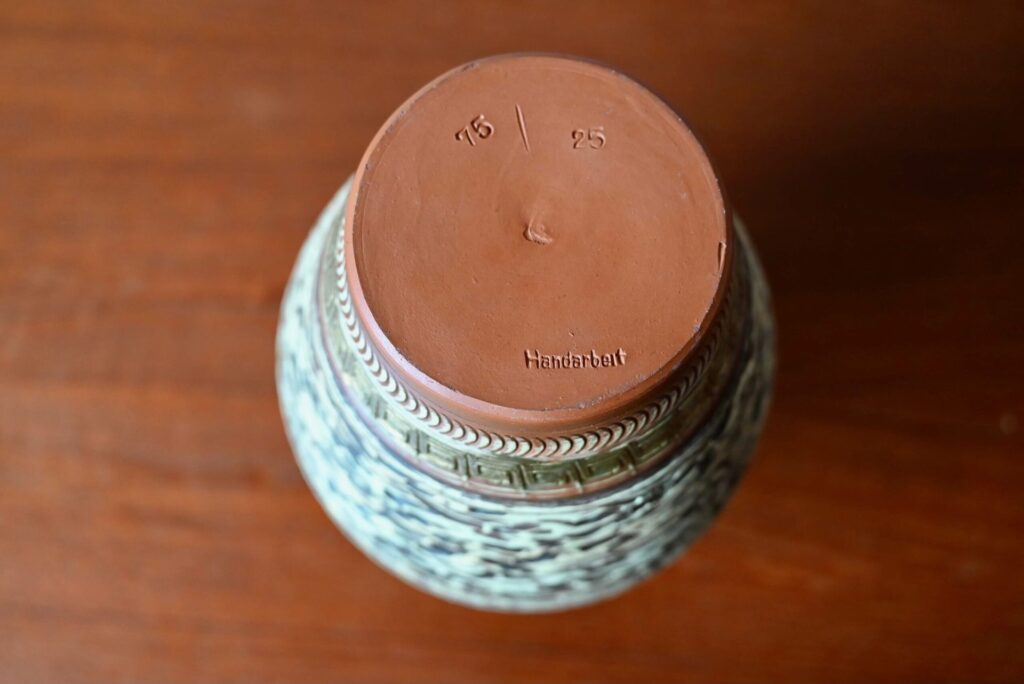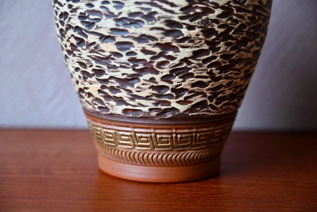 Ce grand vase scarifié à l’allure ethnique et brutaliste a été produit par SP Hillscheid en Allemagne. C’est une céramique intéressante, à l’aspect très rythmé et graphique.