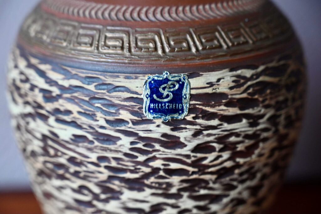 La céramique brutaliste est signée “SP Hillscheid” sur une étiquette, des numéros sont également tamponnés sur l’envers. Le vase est de belle taille, en bel état, il est particulièrement décoratif.