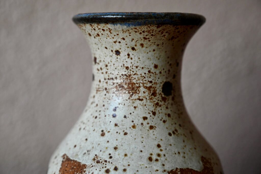 Ce vase danois Ting Keramik est réalisé en grès pyrité. Le potier Henning Rasmussen a su tirer parti de la matière et du feu pour un rendu au grain irrégulier et unique. Le vase présente une esthétique proche de la matière, dans un esprit wabi-sabi.