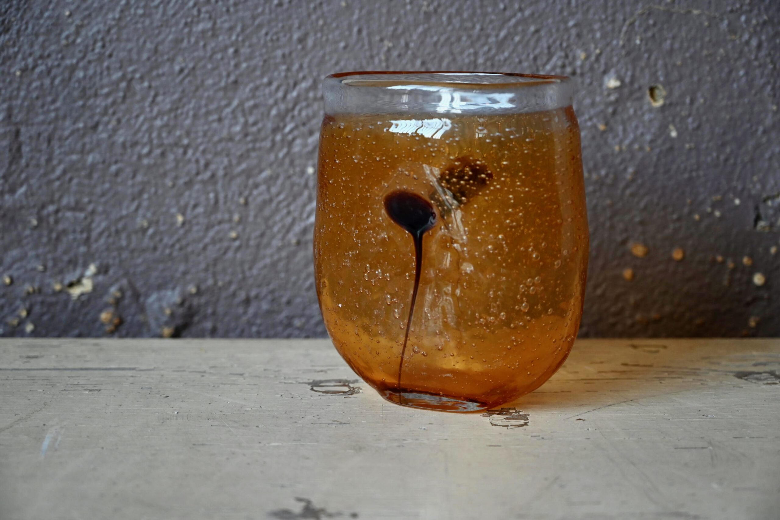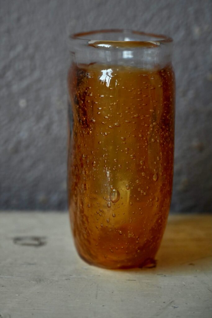 Le vase est en verre coloré, des bulles et une inclusion sont visibles dans sa masse. C’est une production artisanale. Il est en très bel état.