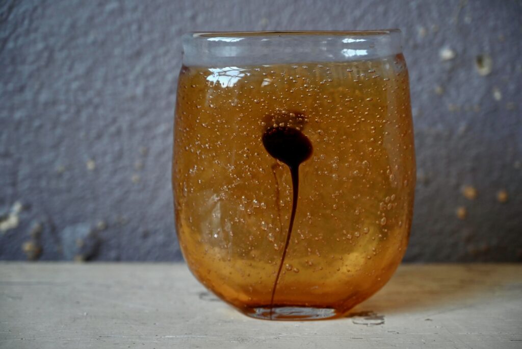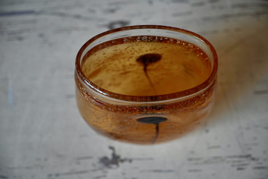 Ce joli vase fin à la forme aplatie, est en verre bullé, jaune et transparent. Une inclusion brune vient animer l’ensemble. C’est une pièce déco originale, lumineuse et colorée.