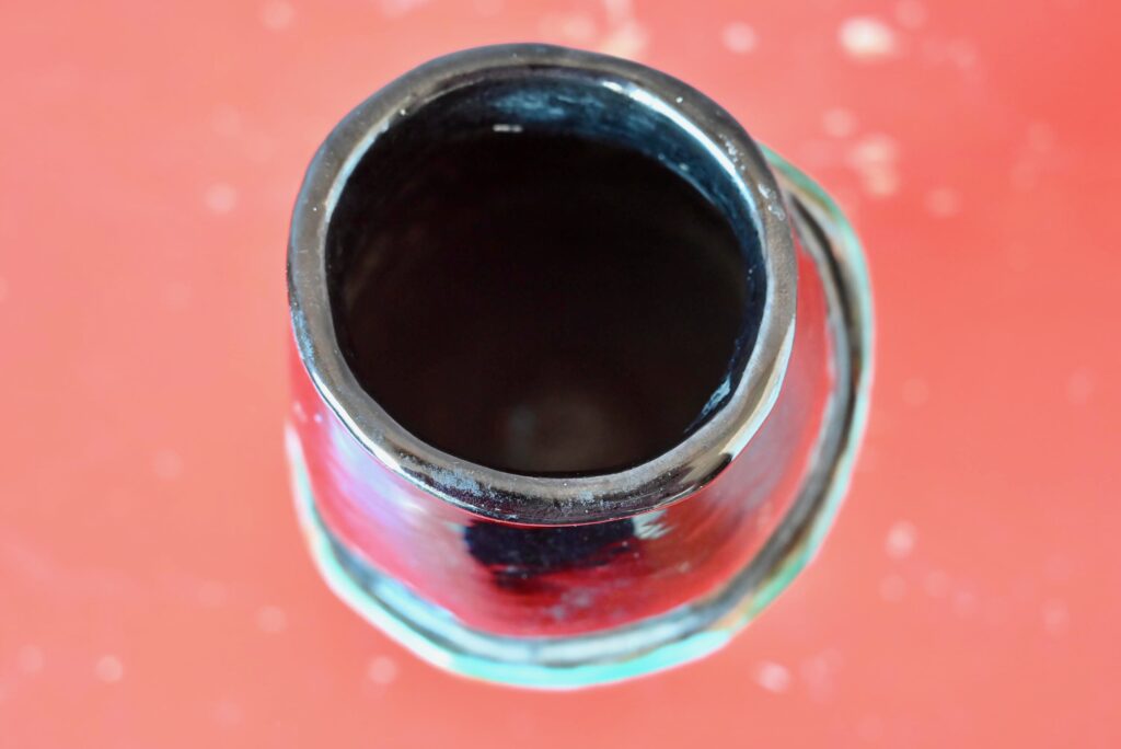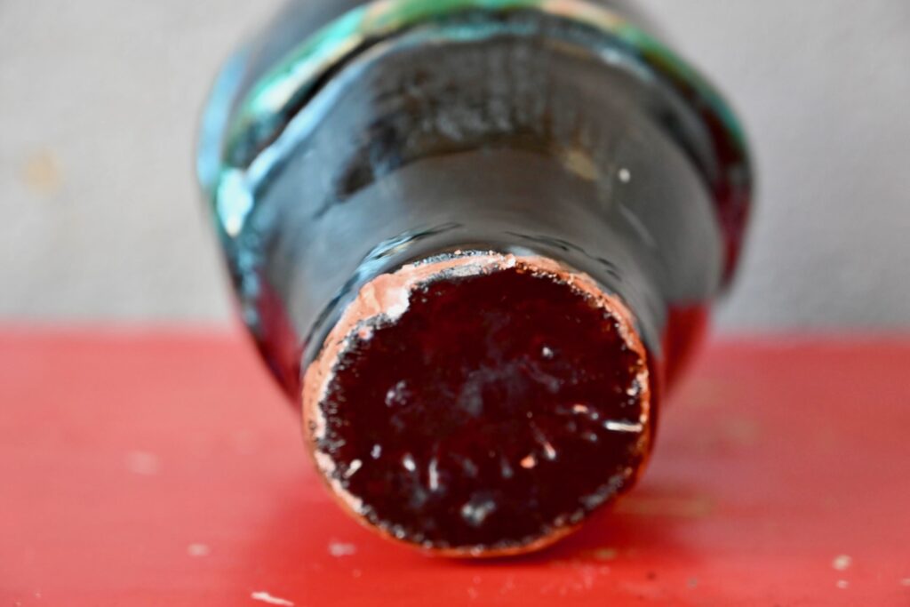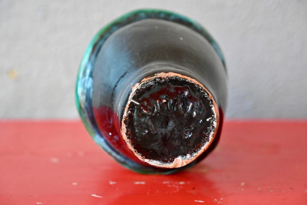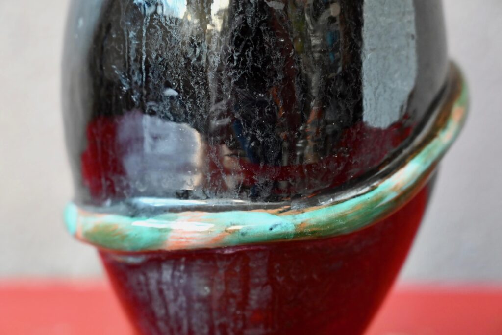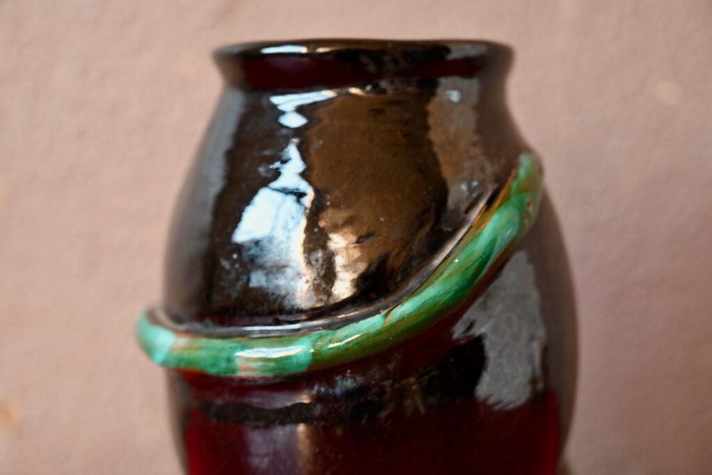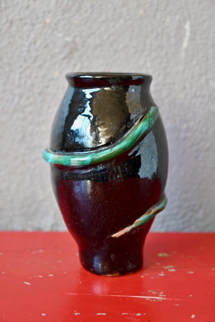 Ce joli vase est doté d’un émail profondément noir, aux reflets irisés, et animé d’une spirale verte serpentant autour de lui. De belles dimensions, de forme oblongue et doté d’un col ourlé, c’est une pièce démonstrative, artisanale et d’une belle présence au modelé épais.