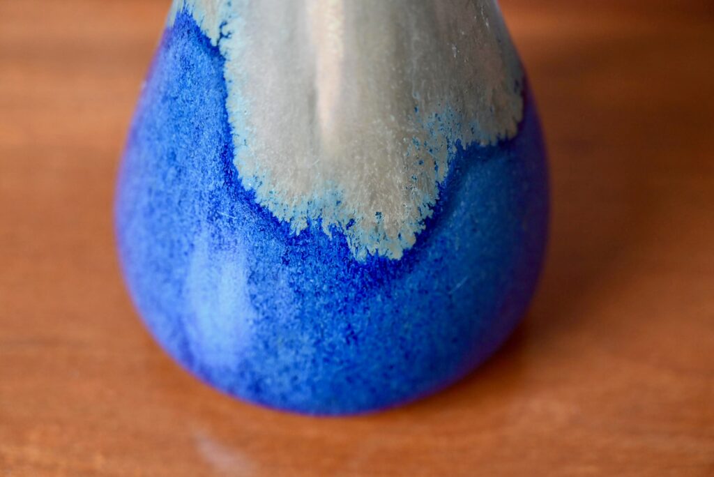 Ce joli vase formant pichet est une production des ateliers de céramique de Denbac. En grès, il possède une forme souple et allongée. Il est émaillé de bleu moucheté, partiellement recouvert de coulure beige. Il constitue une décoration élégante, au charme bohème.