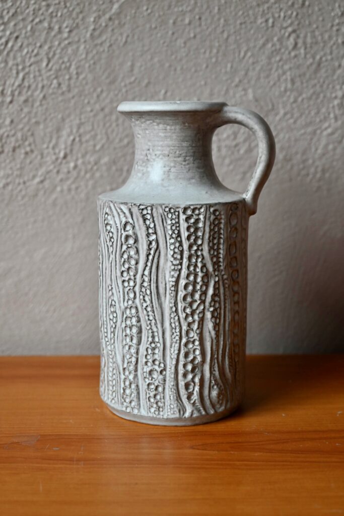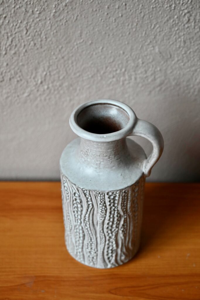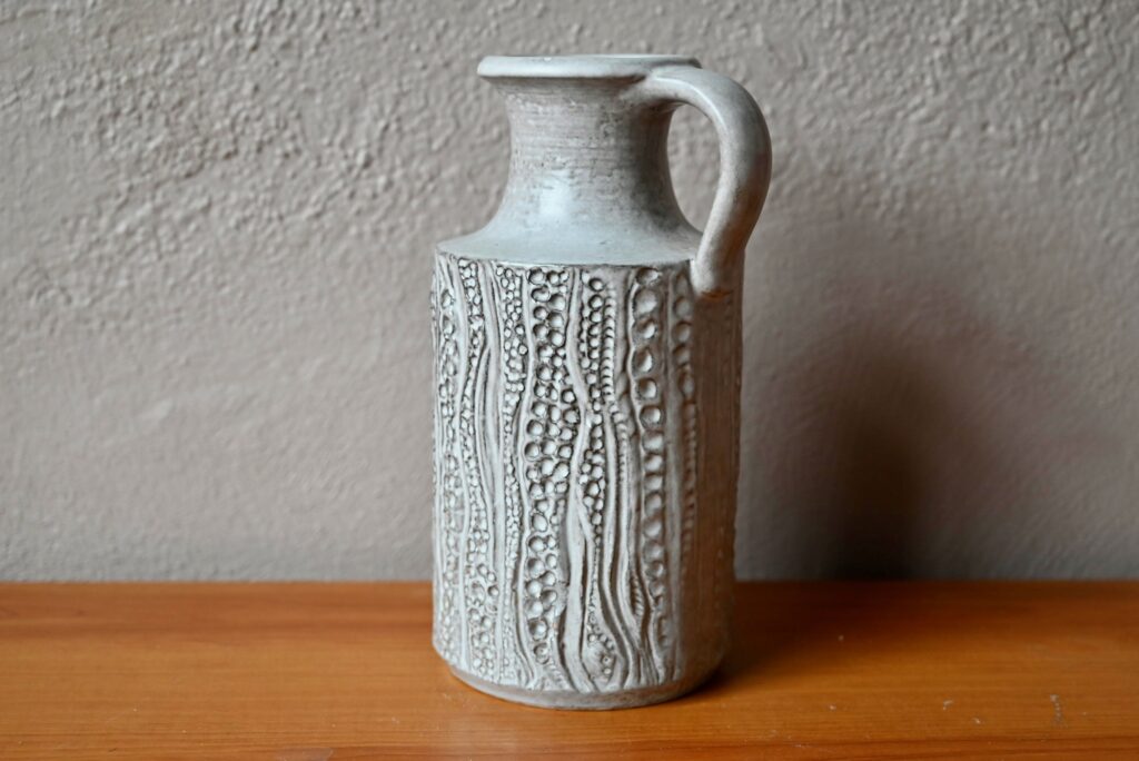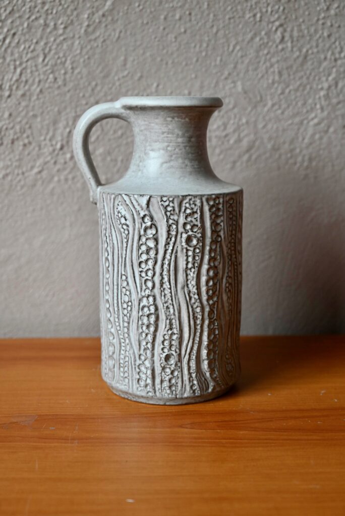 Dotée d’une forme sobre et d’une anse, ce vase pichet est décoré de sortes d’empreintes dont l’effet est renforcé par le travail grisé de l’émail mat. Cette belle céramique possède un fort pouvoir décoratif d’inspiration brutaliste. Charmant vase des années 60, c’est une production des ateliers “Carstens Tönnieshof”.