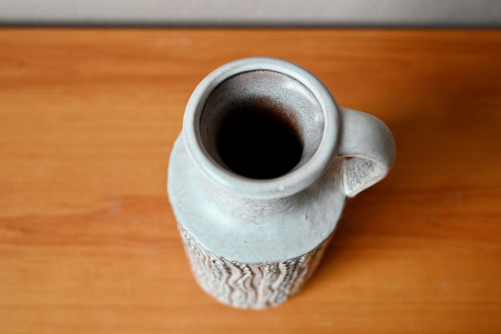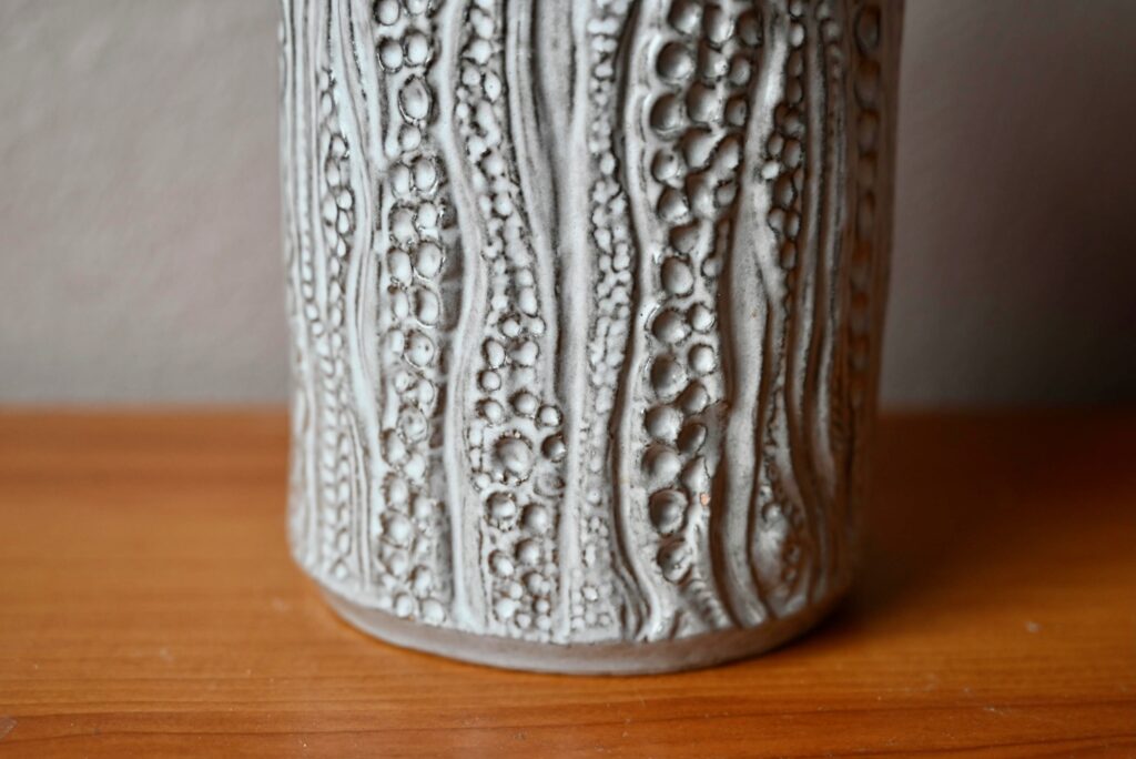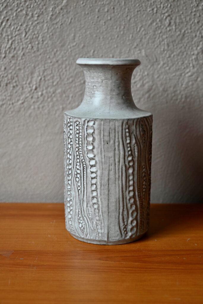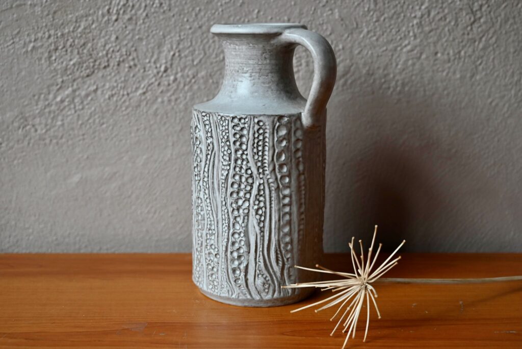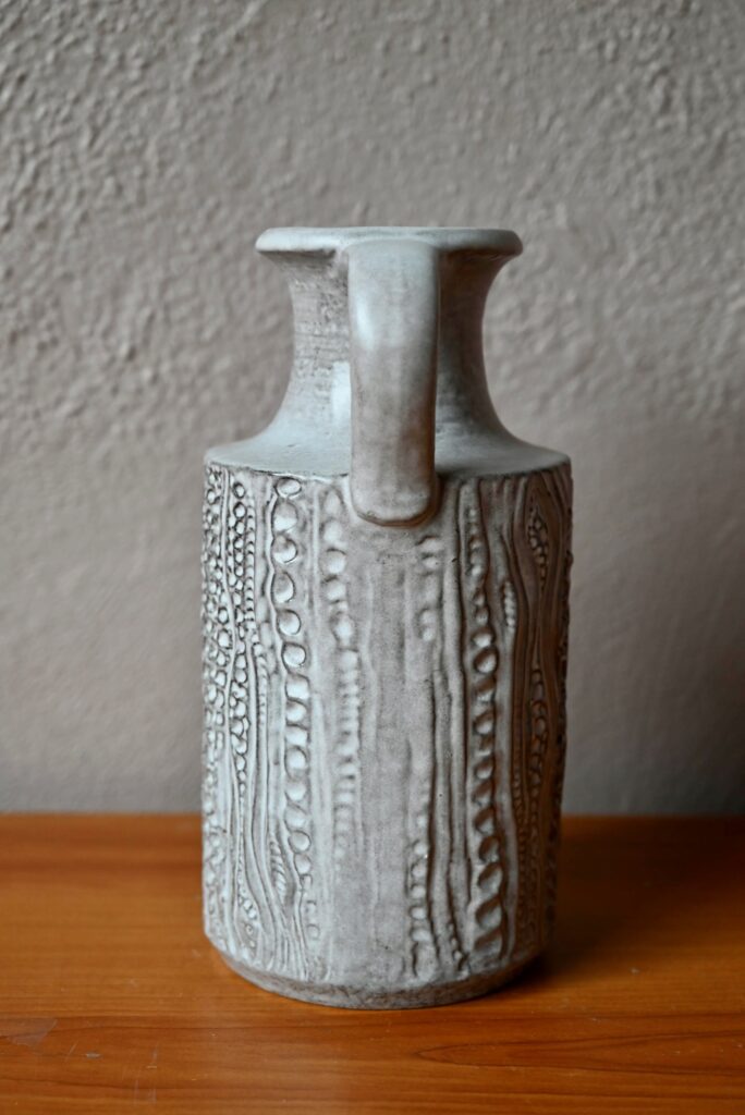 Dotée d’une forme sobre et d’une anse, ce vase pichet est décoré de sortes d’empreintes dont l’effet est renforcé par le travail grisé de l’émail mat. Cette belle céramique possède un fort pouvoir décoratif d’inspiration brutaliste. Charmant vase des années 60, c’est une production des ateliers “Carstens Tönnieshof”.