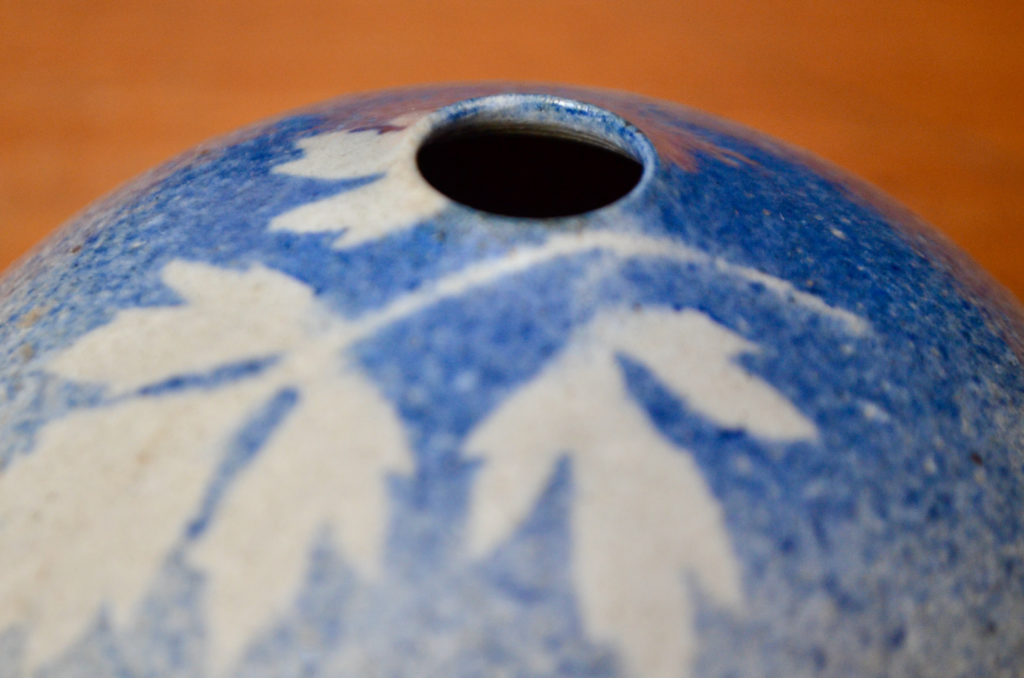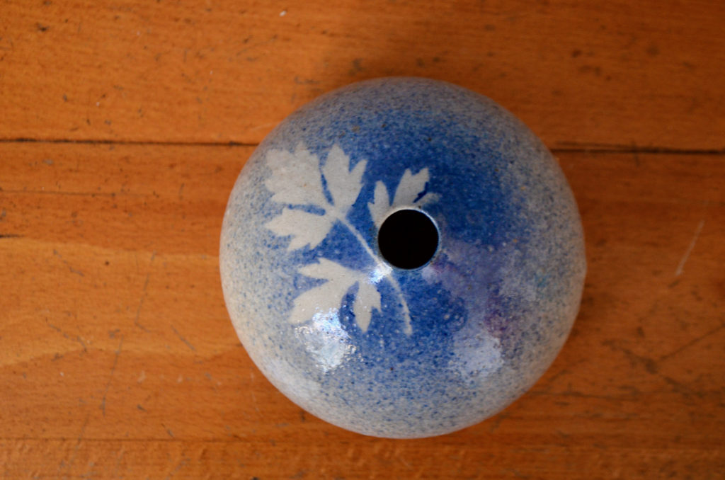 Pique-fleurs en céramique vintage et bohème, ce charmant petit vase est une production artisanale pleine de poésie. Réalisé en céramique, il s’exprime dans des tons gris-bleu, moucheté et décoré de motifs végétaux estampés.
