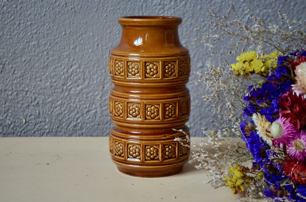Avec son décor géométrique et répétitif en relief, sa forme cylindrique et son émail beige, ce vase est une jolie pièce déco. Fabriquée par Scheurich, c’est une belle production typiquement vintage, pleine d’énergie et d’un dynamisme visuel original.