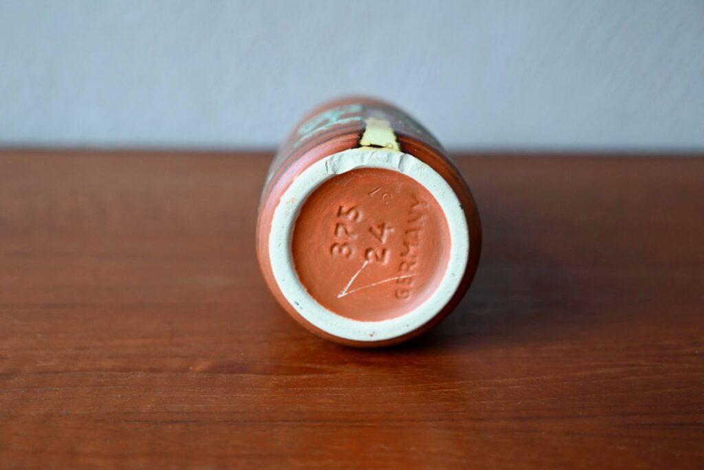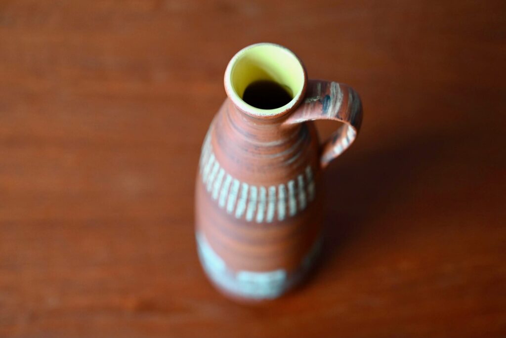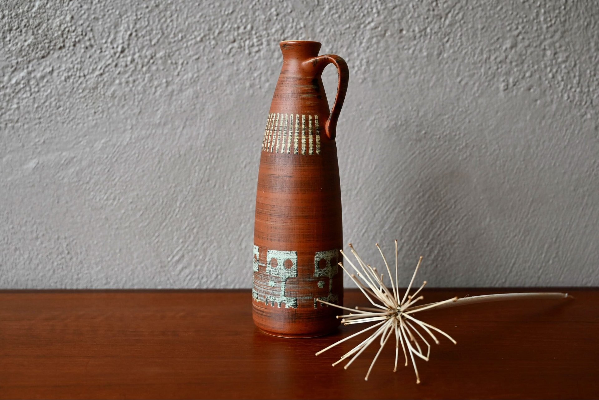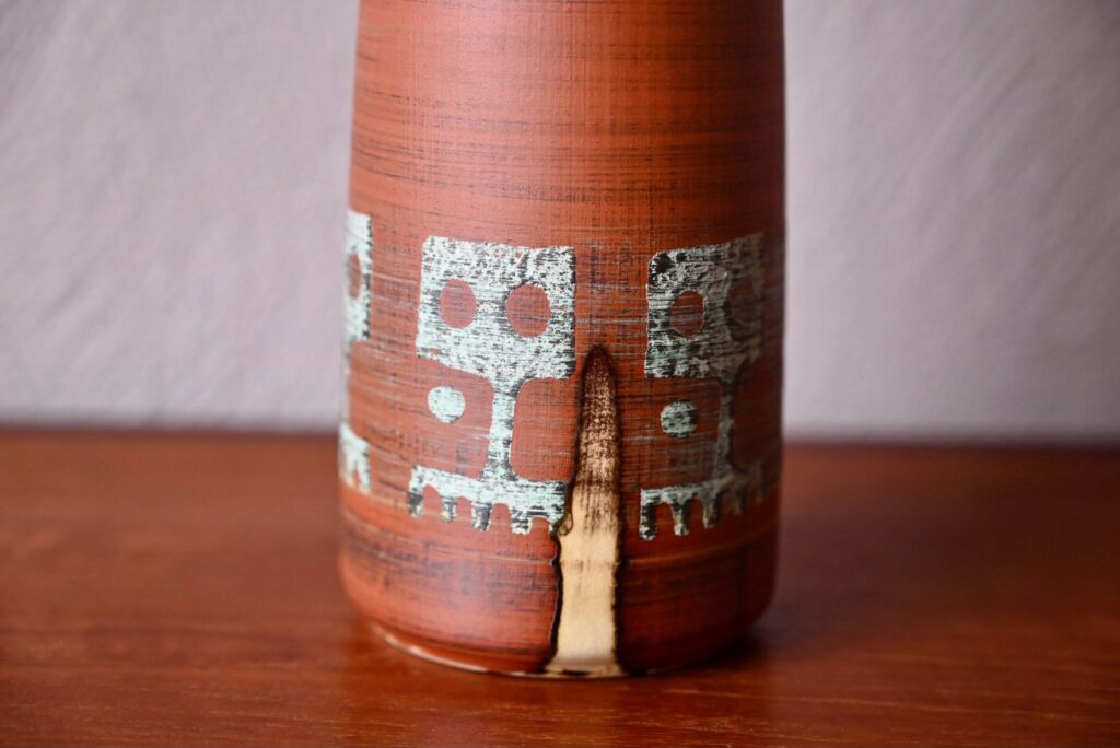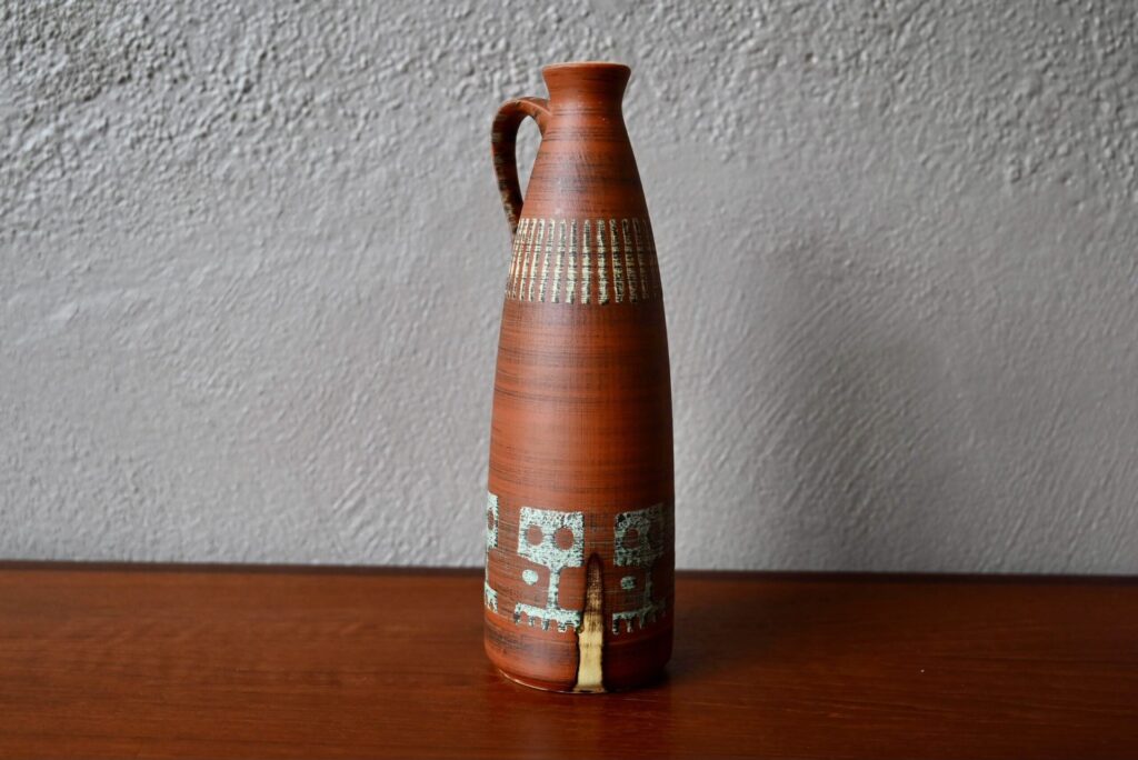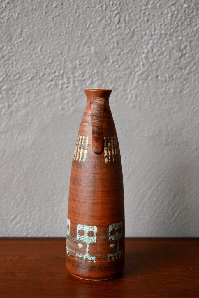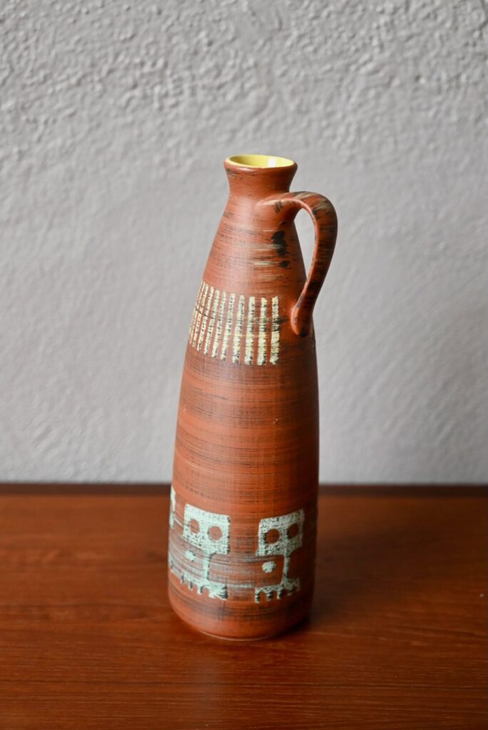 Produit dans les années 60, ce joli vase à la forme pichet soliflore est décoré de motifs esprit ethnique sur un fond terracotta. Jolie pièce déco, il sera en valeur sur une belle enfilade vintage ou apportera son petit grain de sel sur une étagère murale.