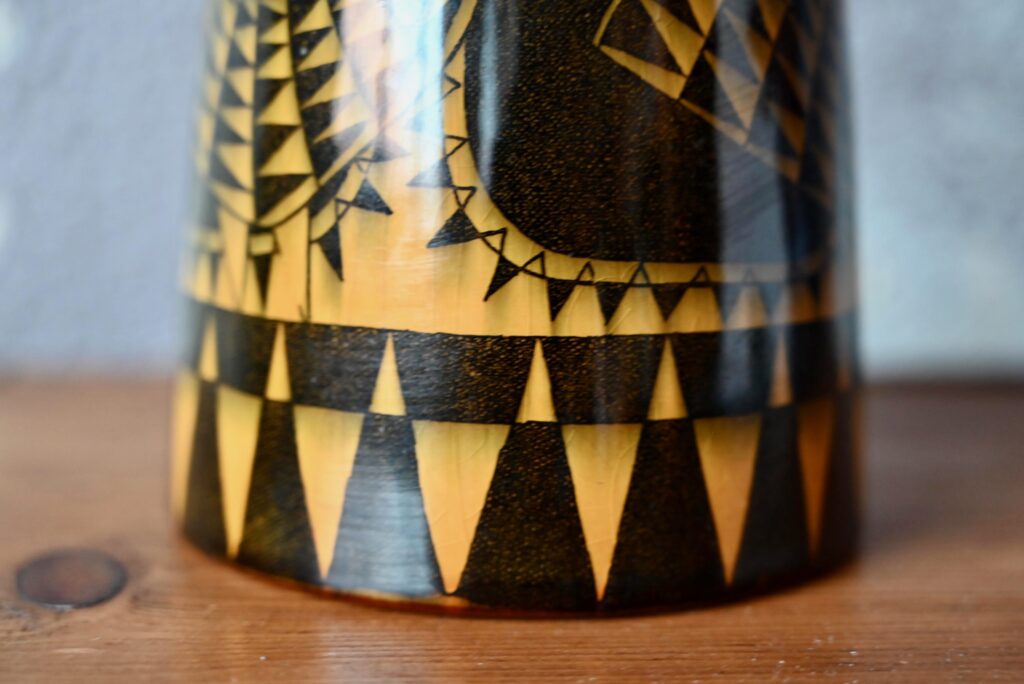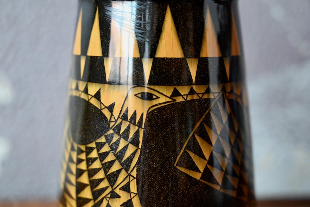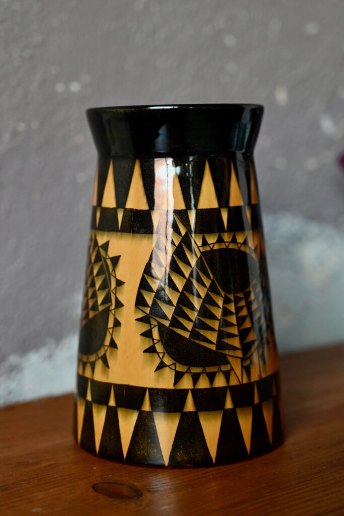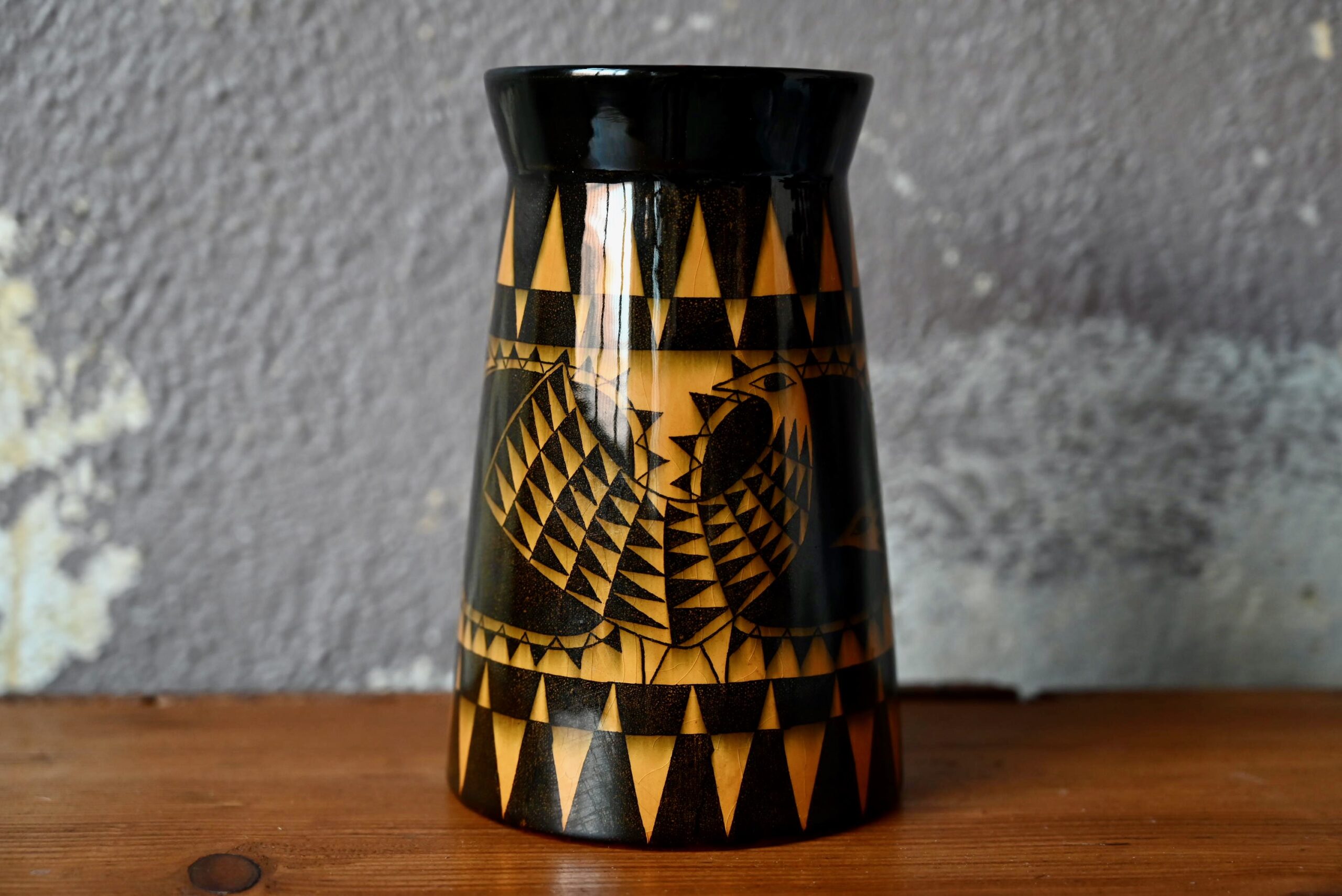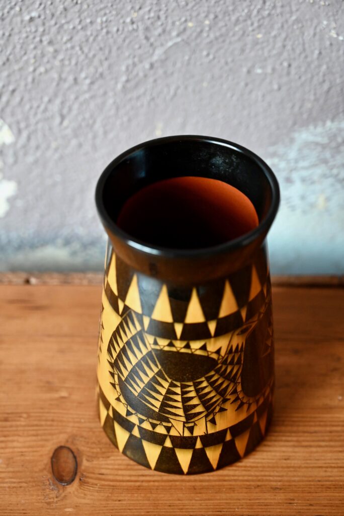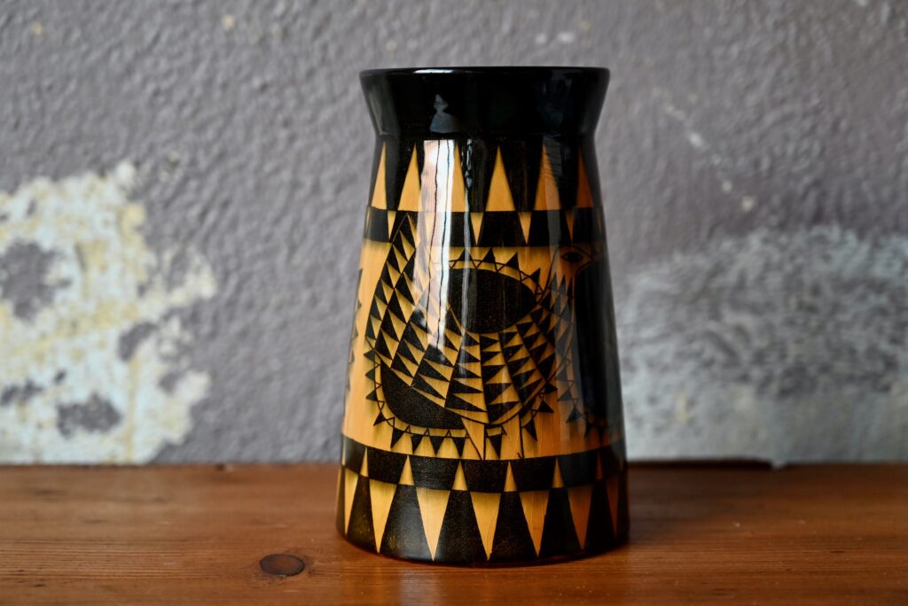 Ce vase est une production suédoise des années 50 de la firme Rörstrand à Lidköping. Pièce décorative, toute en finesse, sa forme moderne et discrète laisse toute la place aux motifs “Beppo” typiquement scandinave fait de fleurs et oiseau stylisés jaune-orange sur fond noir d’une brillance intense. C’est une pièce de céramique très décorative et joyeuse.