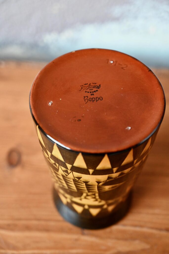 Le vase suédoise a été fabriquée par la firme Rörstrand à Lidköping. Il est en très bel état. Avec son motif “Beppo” typiquement scandinave, il offre de belles couleurs et un brillant impressionnant. La céramique est estampillée sur le dessous.
