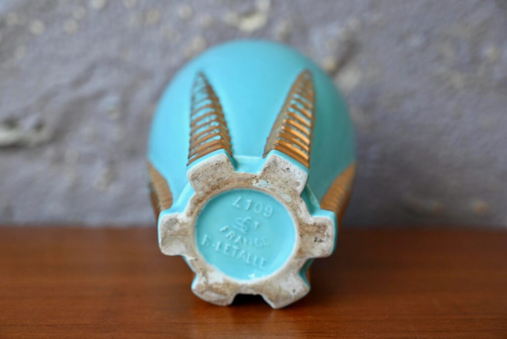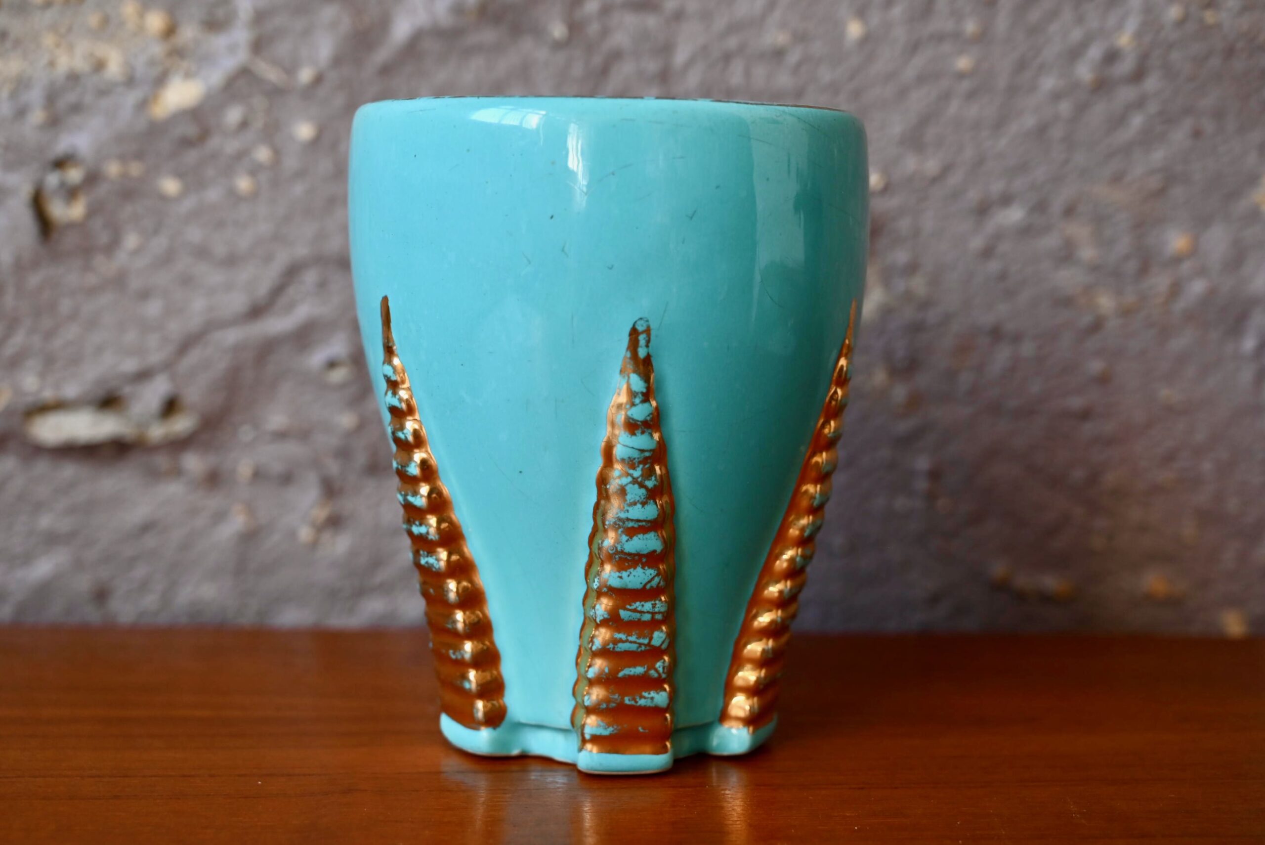Dans le vent de modernité qui anime les années 50 et 60, les potiers et céramistes ne sont pas en reste ! Ils inventent et réinventent les formes des objets en terre cuite, jouent sur la composition des émaux pour obtenir des couleurs ou de textures nouvelles. La faïencerie lorraine de Saint Clément est liée à celle de Lunéville. A Lunéville est produite de la faïence fine, souvent usuelle et classique, services et assiettes à motifs. Pendant ce temps-là, Saint Clément invente formes et couleurs. Dans la seconde moitié du 20ème siècle, Jacques Roux et Blanche Lettale exploreront les possibilités stylistiques de la faïence. Dans un style dépouillé et novateur, cette dernière proposera des vases aux formes organiques, avec des émaux souvent monochromes ou bicolores. Ce vase de Blanche Letalle est marqué par l’esprit ArtDéco. Dans un ton turquoise, il est habillé d’éléments dorés en relief.