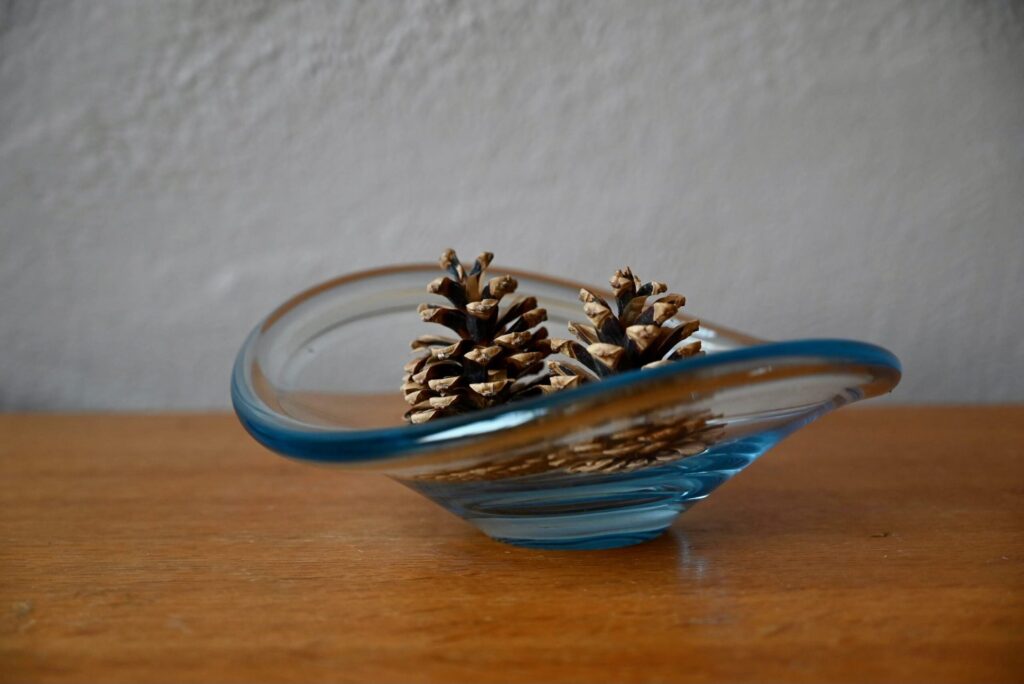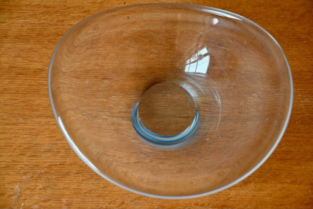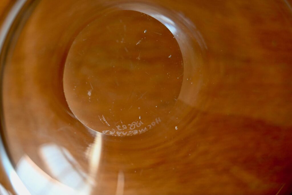 La coupe est ancienne et date des années 50. Elle est en verre épais, transparent. Les lignes sont tout en arrondis, très douces. Des traces d’usage sont visibles en photo. La coupe porte la signature gravée de la verrerie Holmegaard, la signature de l’artiste et est numéroté sur le culot. Holmegaard est une des verreries les plus réputées du Danemark, et produira une partie des plus belles pièces de verre soufflé du pays durant les années 50 et 60.