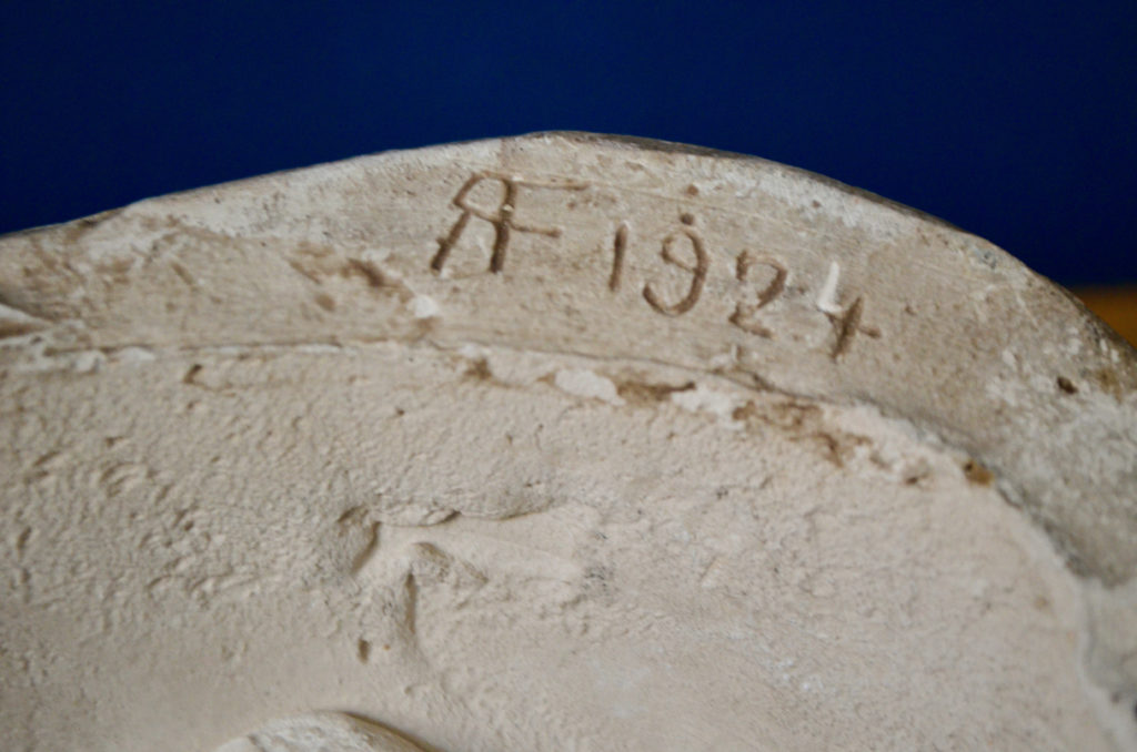 La pièce est un visage d’enfant en plâtre. La surface est patinée et montre des traces du temps. La pièce est datée 1924 et signée d’un mystérieux monogramme. C’est une pièce de décoration unique, au joli modelé.