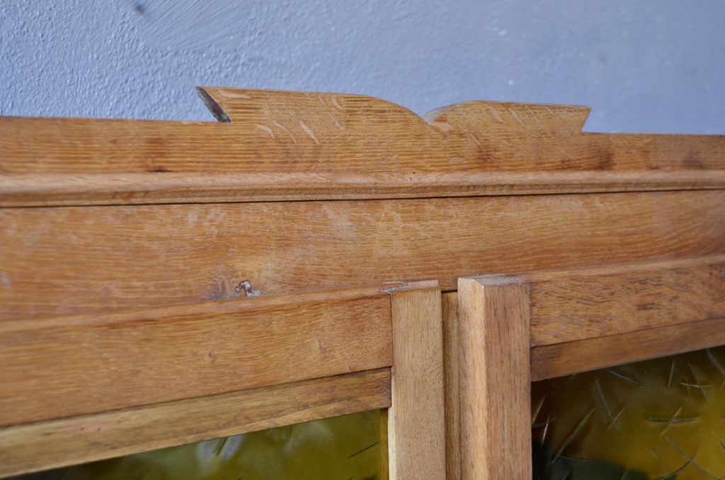 La vitrine est ancienne et date des années 50. Elle est en chêne et placage chêne, teinte miel foncé. Elle possède un piétement compas et un fronton élégant. Les portes sont vitrées, verre imprimé jaune d’origine. Serrures et clef sont d’origine. Le caisson possède des étagères, un vinyle vert lessivable les couvre. Quelques légères traces d’usage sont présentes, l’ensemble est en très bel état.
