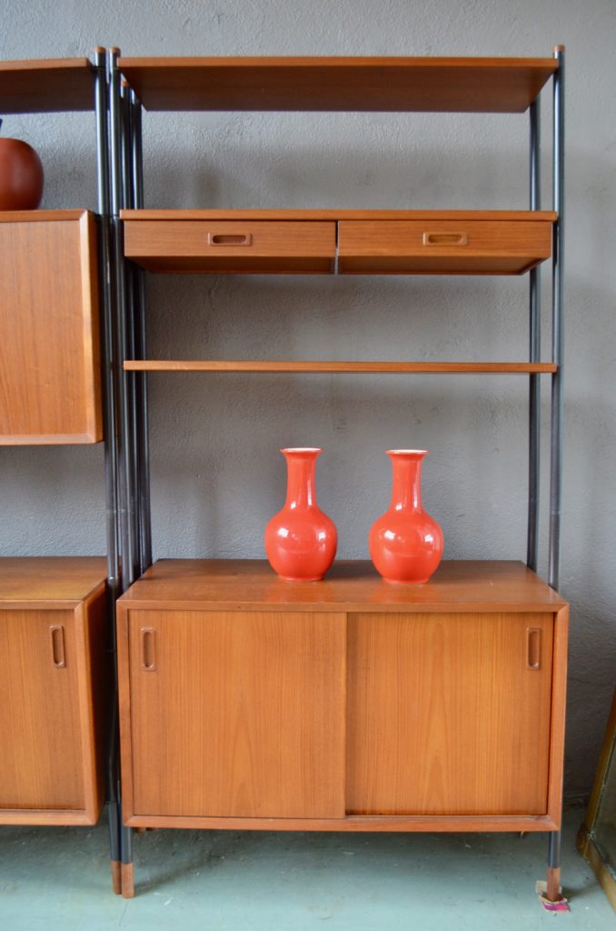 Ce grand ensemble de mobilier modulable est une production danoise des années 60. Le fabricant “Lyby Møbler” nous propose une solution de rangement haut de gamme, fonctionnelle est adaptable à toute les situations. Les éléments sont en teck, ils sont portés par une structure en métal laqué marron-noir, joliment coudé au niveau du piétement. Patins et finition haute sont en teck. L’ensemble dispose de tablettes, étagères, caissons de rangement, tiroirs, commode et d’un bureau-secrétaire. Tous ces modules peuvent être disposés au gré des envies et besoins. L’étagère modulable pourra donc devenir une bibliothèque, un espace de travail, un meuble HIFI ou tout à la fois. Dans un pur style scandinave, son design simple et lisible met en valeur la chaleur du teck au moyen de lignes évidentes et d’assemblages soignés.